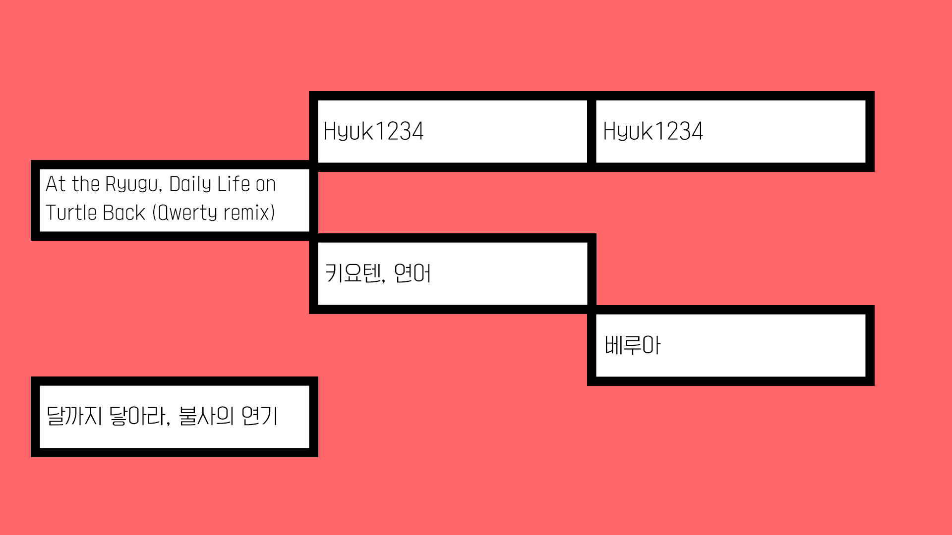 그리고 약간의 변수로 “단일곡 합작”을 넣어보려는 아이디어도 있었습니다. 곡들이 죄다 똑같다면 웃길 거라고 생각했는데, 막상 넣을만한 적절한 단일곡 합작이 없어서 아쉽게도 무산되었습니다. 출제진 검수 과정에서는 <신 트리거 해피 합작>을 출제했었는데 아무도 맞추지 못했습니다. 역시 이런 합작은 제목을 기억하기가 쉽지 않죠.