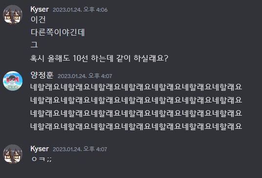 다행히도 양측 모두의 동의로 양정훈 씨가 들어오게 되었습니다. 그 후로도 릴라 님이나 모르는 사람 님이 들어오면서 올해 10선은 10명이서 진행하게 되었습니다.