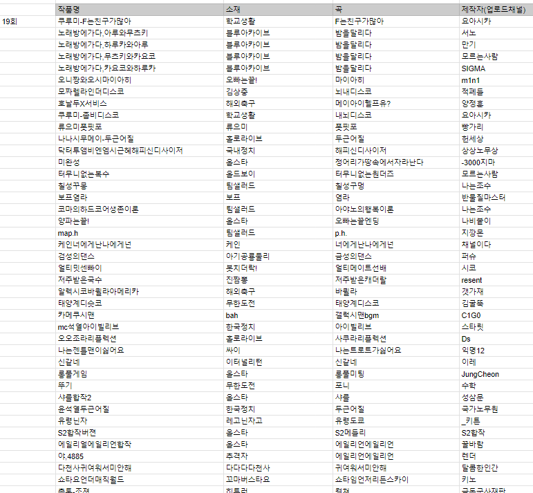 시트를 만들어서 일일히 소재, 곡, 제작자를 정리했는데 정말 힘들더군요. 그래도 1년 단위라서 다행이었습니다.
