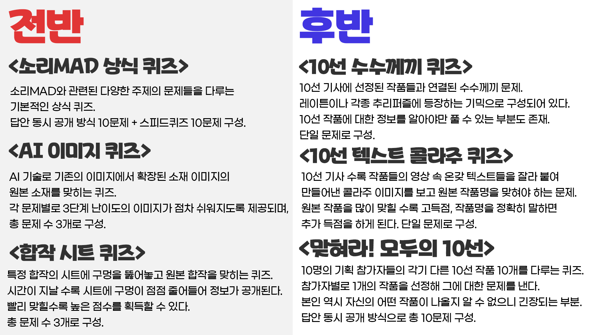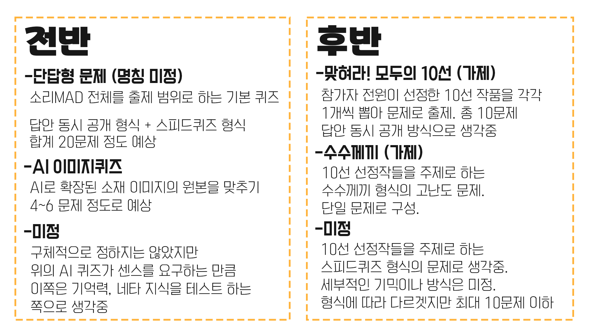 우선 전반적인 구성을 어떻게 해야 할지를 생각해보기로 했습니다. 당시 회의를 통해서 소리MAD 전체를 주제로 하는 ‘전반전’과 10선 기사에 선정된 작품을 주제로 하는 ‘후반전’을 진행하는 것으로 정해졌기 때문에 전반전과 후반전에 어떤 퀴즈들을 넣을지를 고민했습니다. 아래 이미지는 제가 만든 처음 생각한 퀴즈쇼 구성도입니다.
