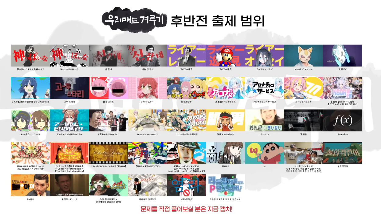 한국에서 얼티밋 선배 MAD에 하이라이트 도중 어떤 곡을 섞는 형식이 생겼는데, 이 형식에 대해서 문제를 내면 좋겠다 싶어서 해당되는 작품들을 가지고 문제를 냈습니다. 정답에 해당하는 작품이 다른 작품에 비해 조회수나 인지도가 상대적으로 낮아서 당시 출제진 검수 과정에서도 좀 어려운 문제라고 평가받았고, 최종 라인업에서는 떨어졌습니다.